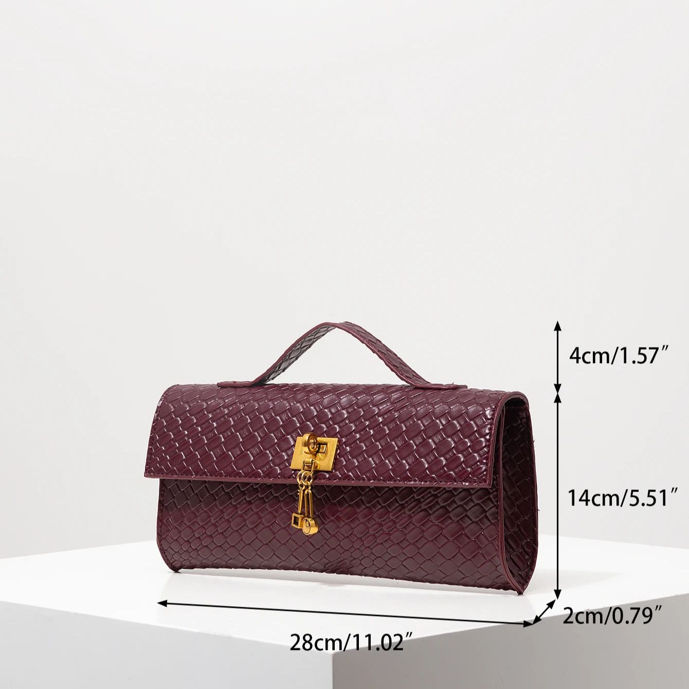 Ervaar de luxe van bespoke vakmanschap met deze stijlvolle baguette tas, ontworpen met een unieke, geweven textuur die direct een premium uitstraling geeft. De rijke bordeauxrode tint straalt tijdloze elegantie uit en maakt dit tasje perfect voor elk speciaal moment—van feestelijke avonden tot chique bruiloften.