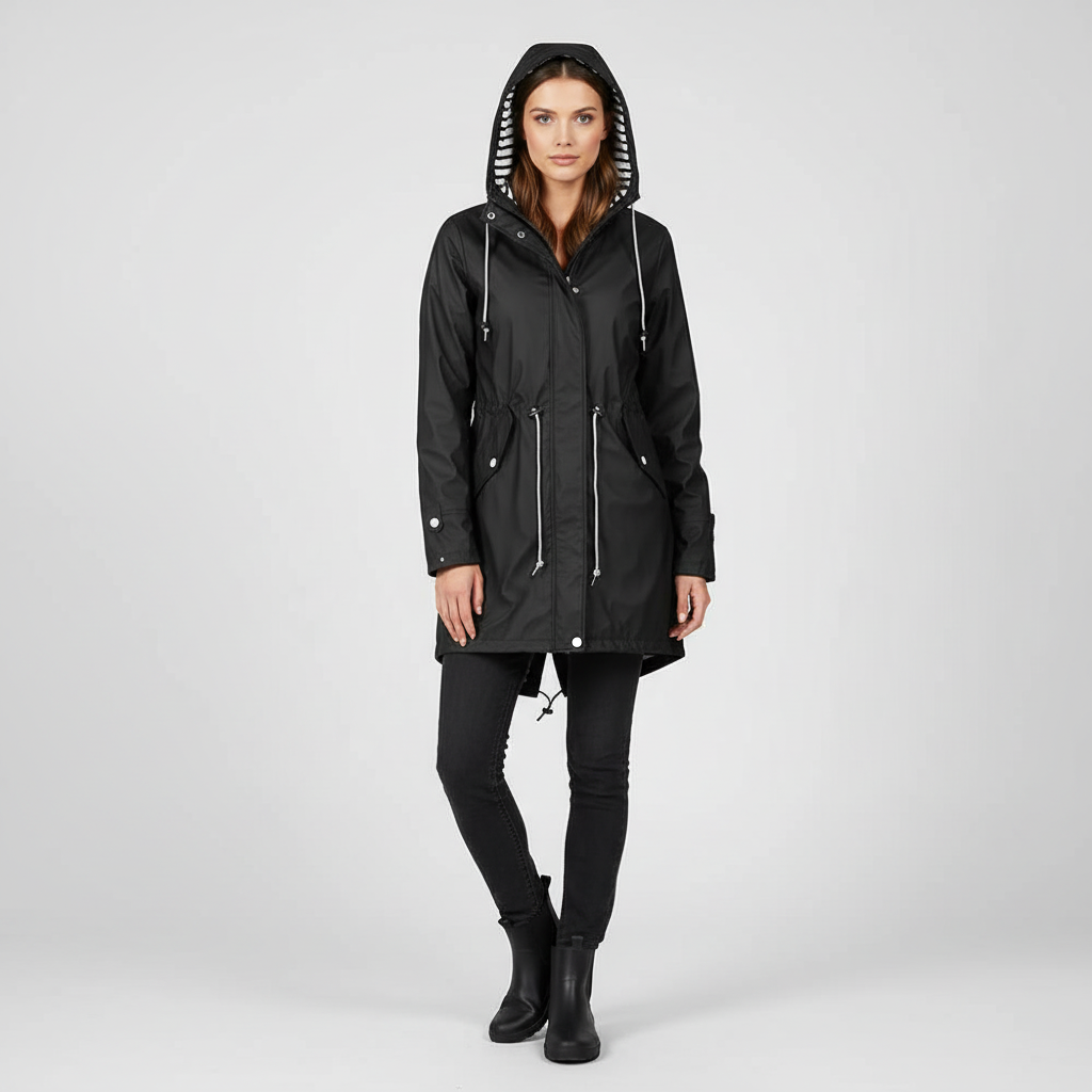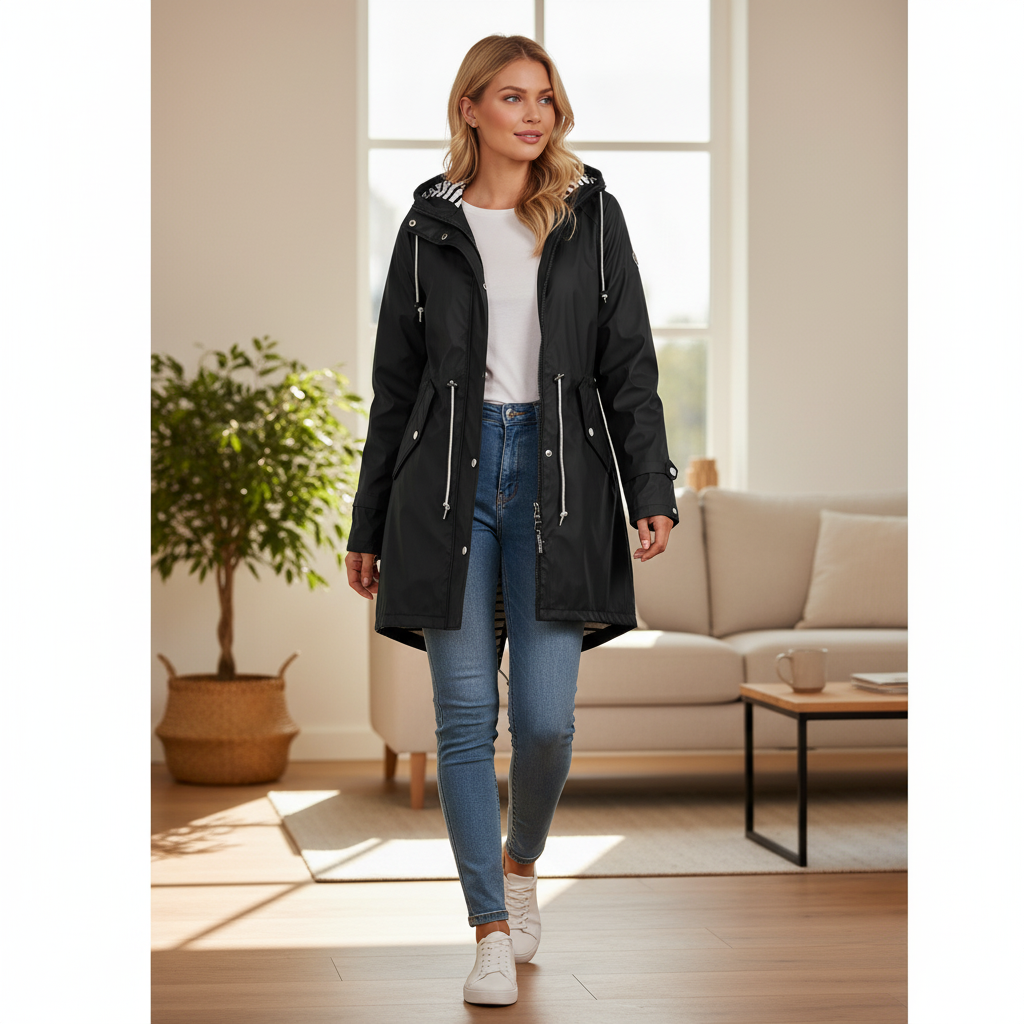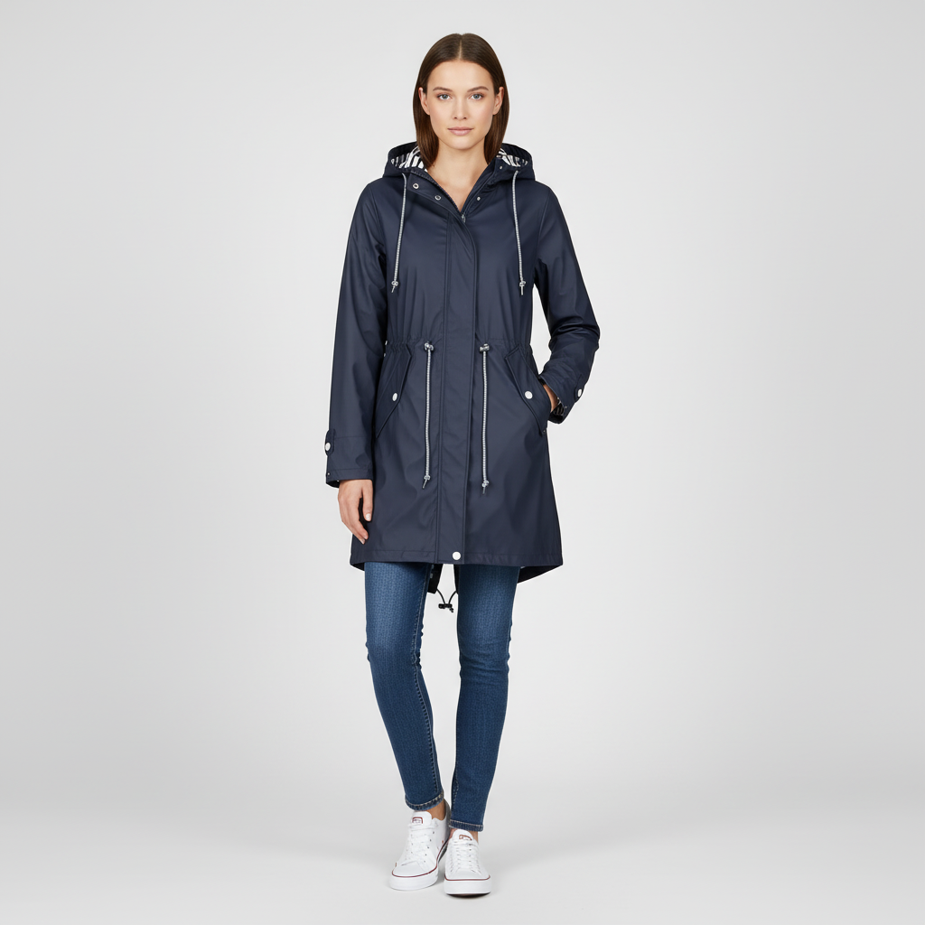De verstelbare taille met trekkoord creëert een flatterend silhouet, terwijl de robuuste rits en drukknopen zorgen voor duurzaamheid en gebruiksgemak. Praktisch, elegant en moeiteloos te stylen—de perfecte regenjas voor wisselvallige dagen.