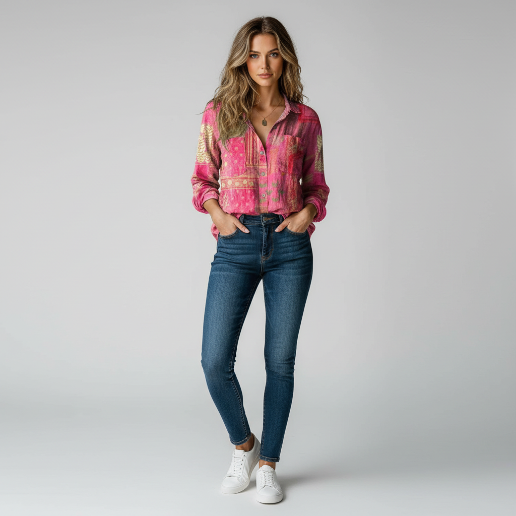 Deze blouse met unieke bandana-print in levendige kleuren geeft elke outfit een frisse, bohemian uitstraling. Gemaakt van een comfortabele linnenmix voelt de stof licht, luchtig en aangenaam aan — perfect voor warme dagen of ontspannen momenten. De relaxte pasvorm biedt optimaal draagcomfort en maakt de blouse ideaal voor zowel casual als speels-stijlvolle looks. Verkrijgbaar in diverse kleuren en maten, zodat je altijd een variant vindt die naadloos aansluit bij jouw persoonlijke stijl.