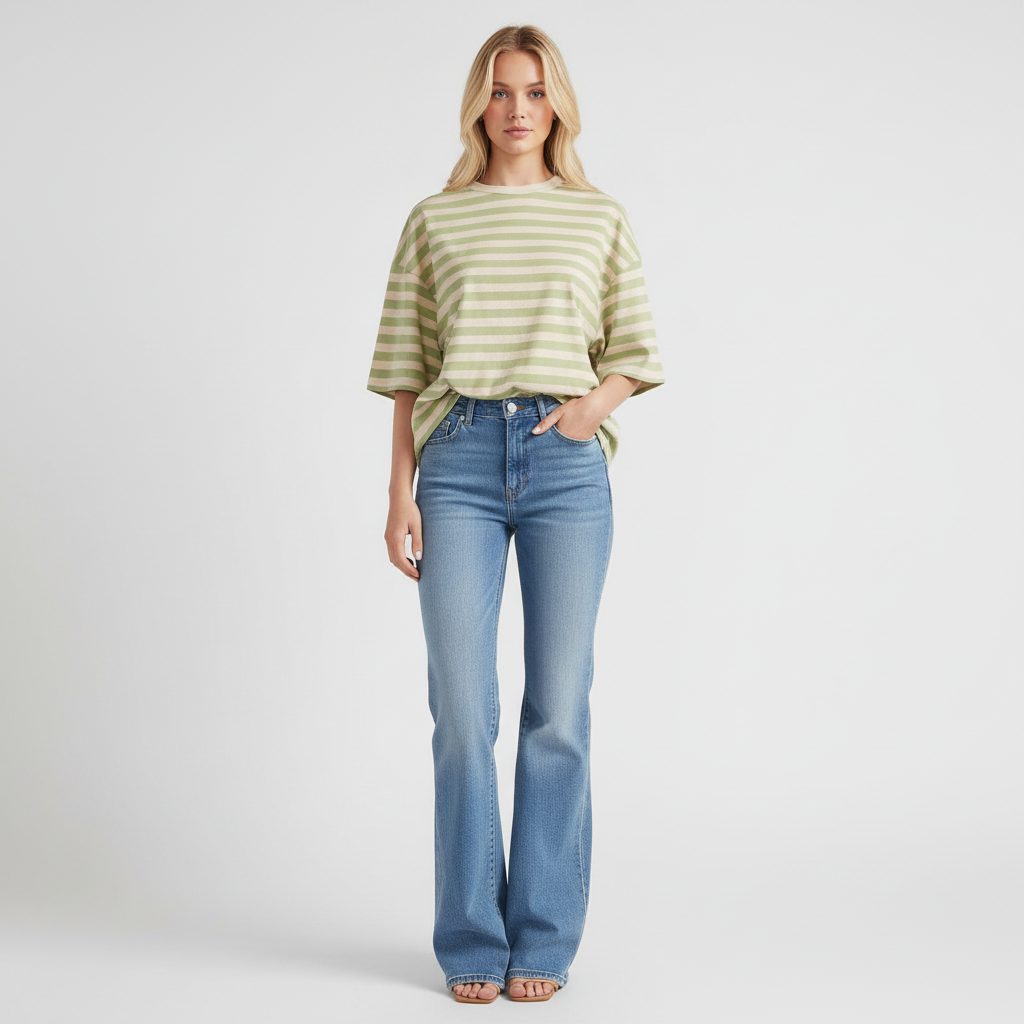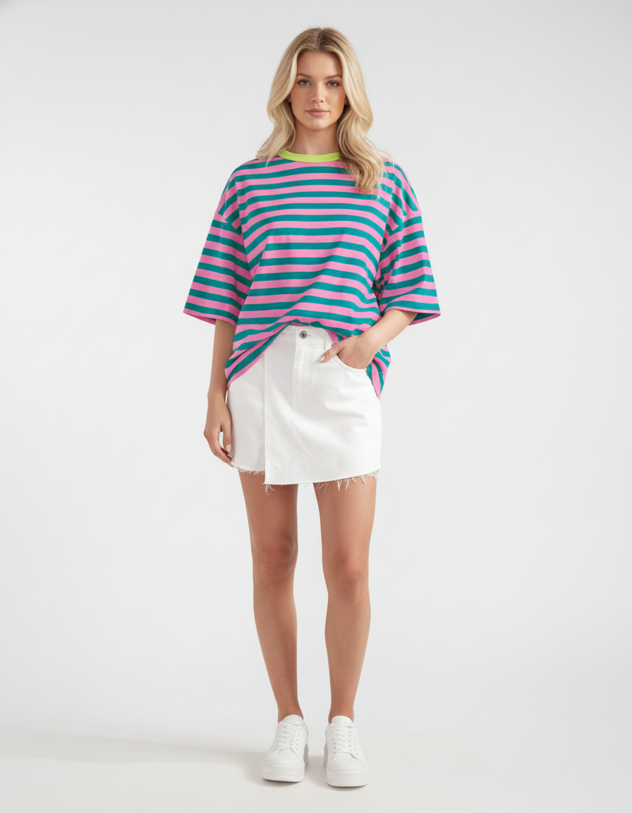Dit luxe gestreepte dames T-shirt is gemaakt van 100% hoogwaardig katoen en voelt zacht, ademend en comfortabel aan op de huid. De relaxte, oversized pasvorm geeft het shirt een moderne, moeiteloze uitstraling die perfect past bij zowel casual dagen als stijlvolle gelaagde looks. De verfijnde, kleurrijke strepen zorgen voor een frisse, tijdloze look die elk seizoen relevant blijft.