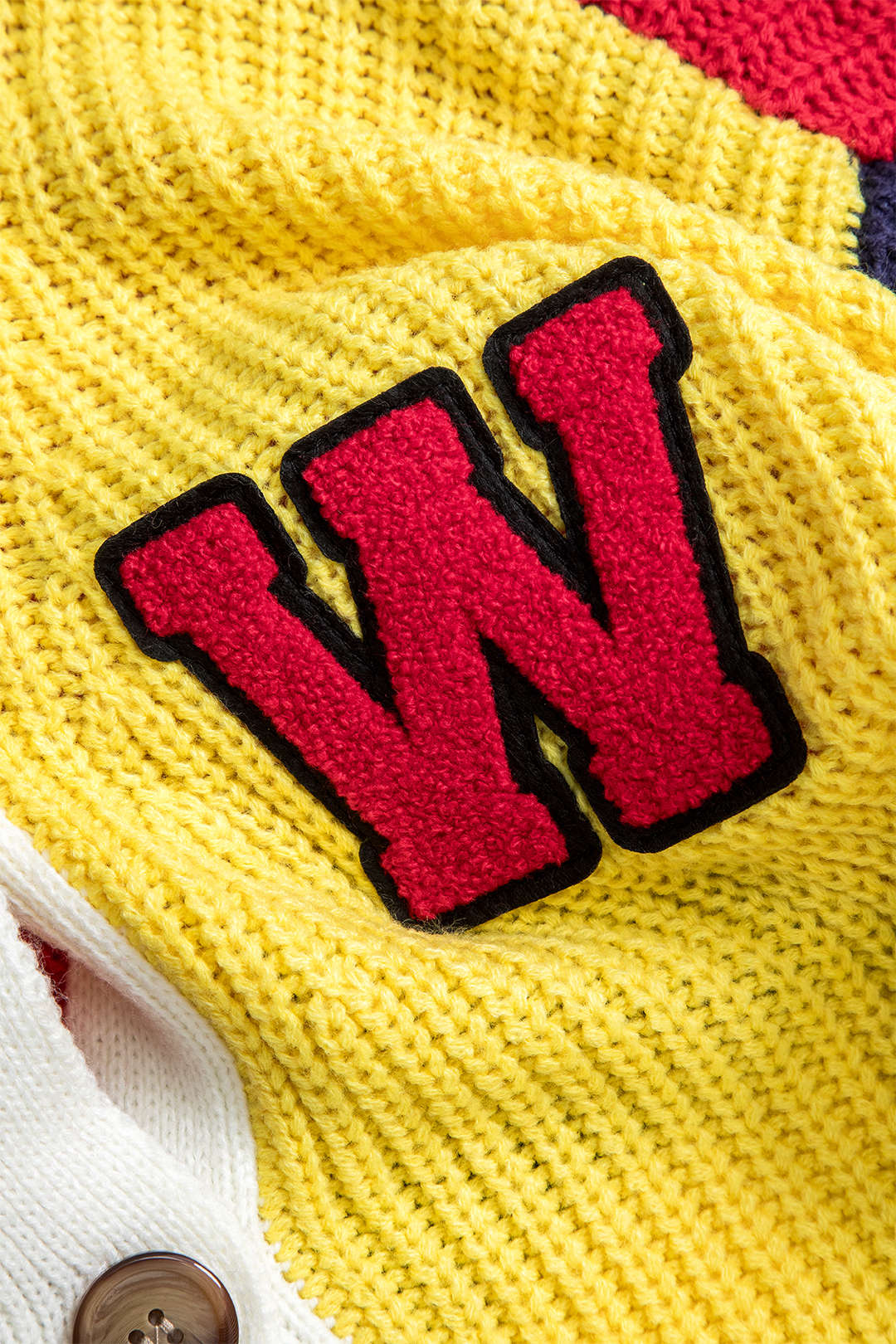 Deze dames sweater met knopen combineert een speels kleurblokontwerp met stijlvolle details voor een frisse, moderne look. De mix van navy, geel, rood en blauw zorgt voor een opvallende, modieuze uitstraling, terwijl de horizontale strepen op de mouwen een extra speels element toevoegen. De iconische geborduurde ‘W’ patch en houten knopen maken de sweater helemaal af.