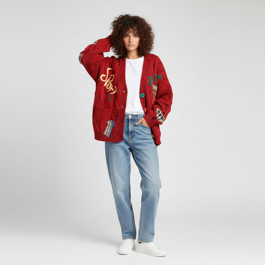 Omarm de kunst van comfort en expressie met dit bijzondere vest van Dea Studios—een tijdloos design dat warmte, karakter en luxe moeiteloos samenbrengt. Verrijkt met bespoke, colourful patchwork accenten viert dit unieke stuk jouw individualiteit en geeft het elke outfit een creatieve, curated uitstraling.