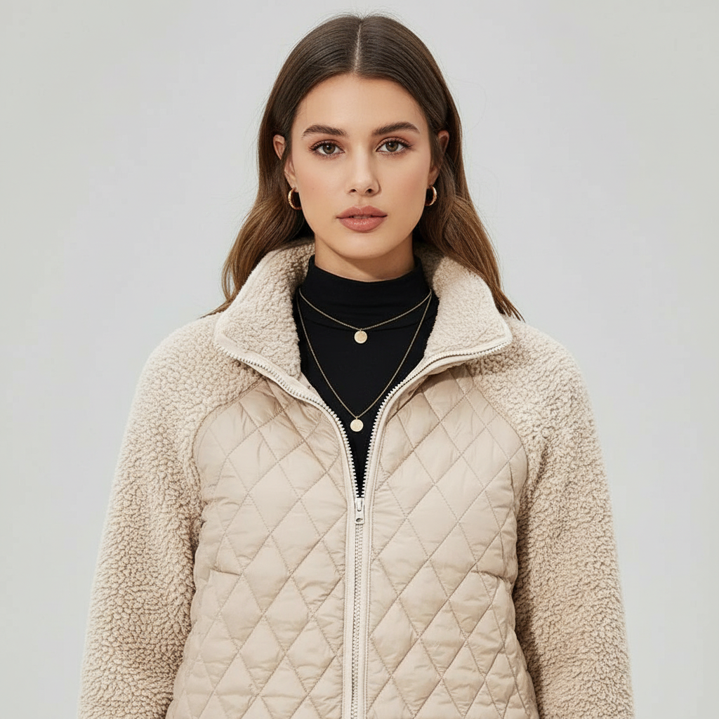 Dit unieke jacket combineert een gewatteerd voorpand met zachte sherpa mouwen en kraag voor een stijlvolle en opvallende look. De mix van texturen zorgt voor een modern en cosy gevoel, terwijl het comfortabele ontwerp ideaal is om te layeren tijdens frisse dagen. Dankzij het veelzijdige neutrale kleurenpalet past dit jack moeiteloos bij al je casual en everyday outfits.