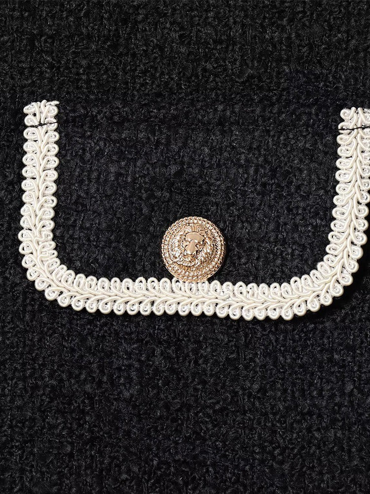 Omarm moeiteloze elegantie met dit prachtige bouclé jasje — een sophisticated item dat elke outfit direct naar een hoger niveau tilt. Het zwarte jasje is afgewerkt met contrasterende witte randen die de ronde halslijn, de single-breasted sluiting en de twee functionele patch pockets stijlvol accentueren.