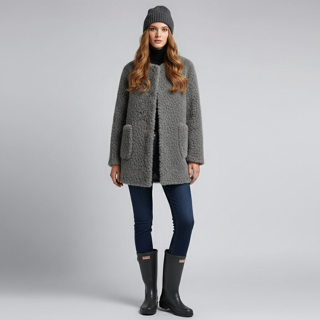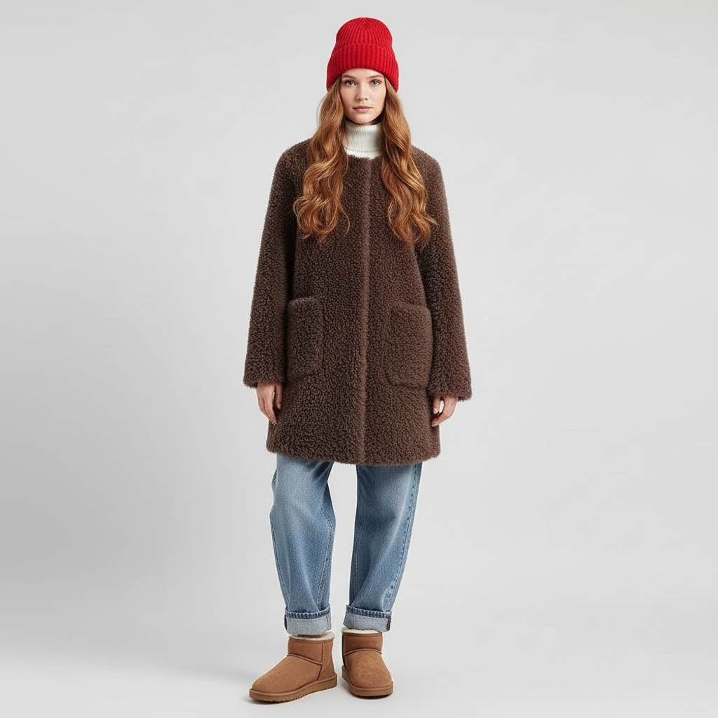 Laat je verleiden door de ultieme winterse knuffel met onze heerlijk zachte, pluizige jas. Ontworpen met een relaxte, openvallende silhouet en praktische opgestikte zakken, is deze jas de perfecte combinatie van functionaliteit en modieuze elegantie. De rijke textuur van het hoogwaardige imitatiebont/shearling voelt ongelooflijk luxueus aan en houdt je gegarandeerd warm tijdens koudere dagen.
