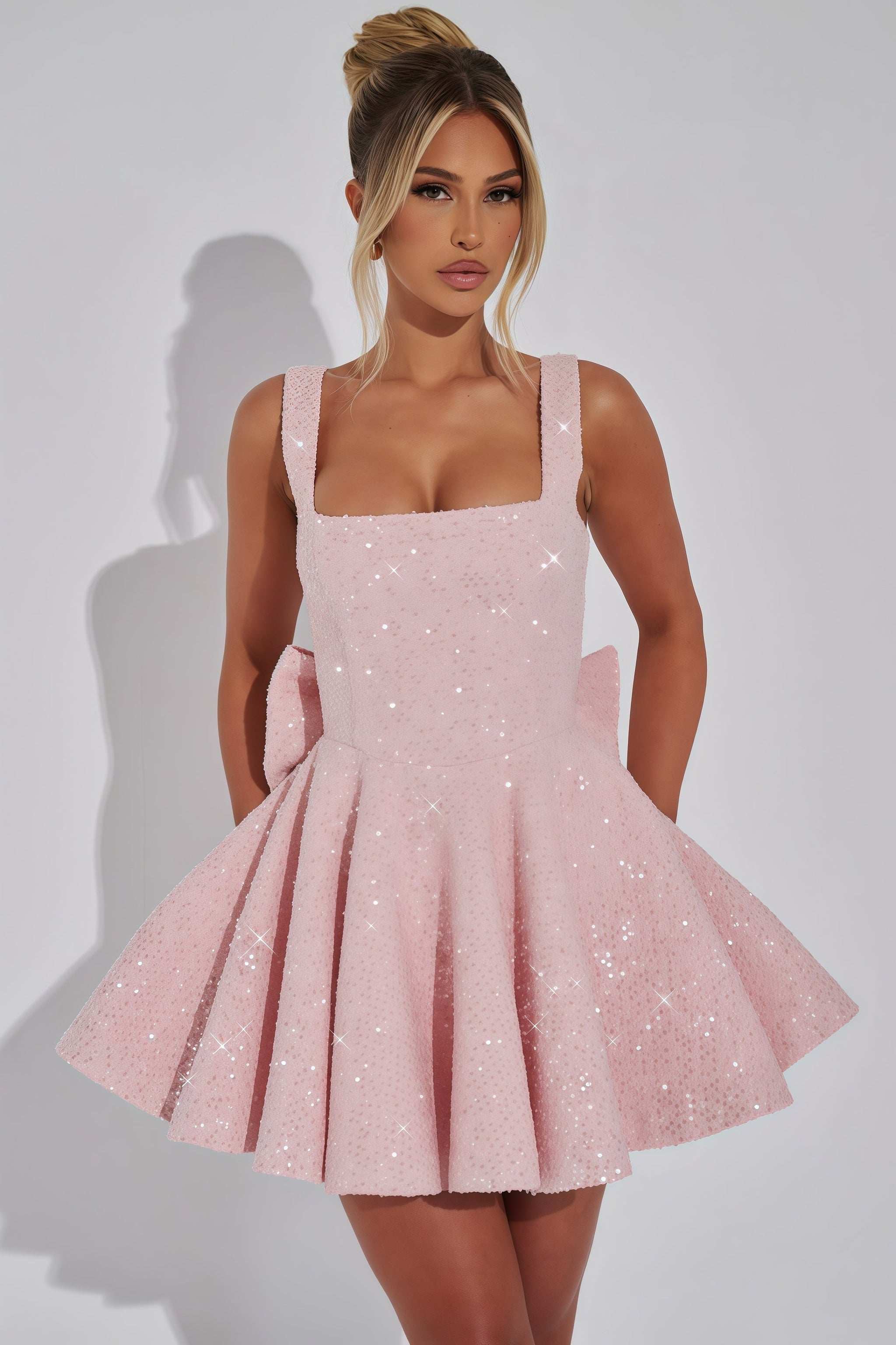 Laat je van je meest betoverende kant zien met deze glinsterende lichtroze mini-jurk. De elegante vierkante halslijn en brede schouderbandjes geven de jurk een chique uitstraling, terwijl de uitlopende rok zorgt voor een speelse en vrouwelijke touch. Subtiele pailletten laten de stof prachtig schitteren, ideaal om indruk te maken tijdens feesten, gala’s of andere speciale gelegenheden. Dankzij de flatterende pasvorm combineert de jurk comfort met stijl, waardoor je je zelfverzekerd en stralend voelt. Een sprookjesachtige jurk die perfect is om mee op te vallen.