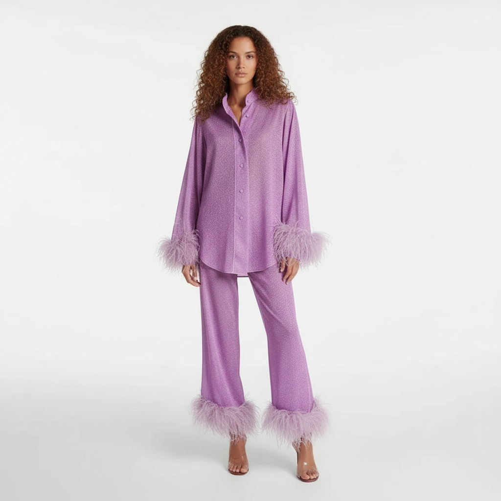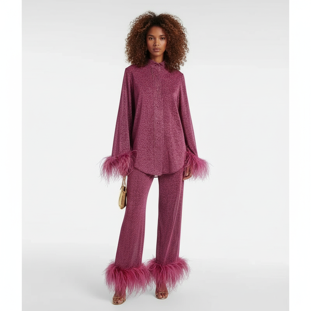 Stap in de schijnwerpers met deze adembenemende tweedelige set van Dea Studios. Gemaakt van een luxueuze, sprankelende synthetische mix, is deze outfit ontworpen om je een onvergetelijke indruk te laten maken. De set combineert een loszittend, langhemd met een klassieke kraag en wijde mouwen met een comfortabele, wijde broek. Beide items zijn verfraaid met speelse, zachte veren die een vleugje glamour en beweging toevoegen aan elke stap die je zet.