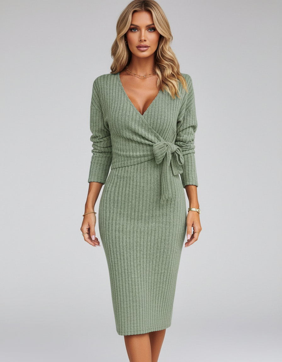 Laat u verleiden door de tijdloze elegantie van onze gebreide midi jurk, uitgevoerd in een verfijnde saliegroene tint. Deze jurk is ontworpen om uw silhouet prachtig te accentueren, met een flatterende V-hals en een stijlvolle wrap-over die wordt samengehouden door een bijpassende strikceintuur. De lange mouwen en de nauwsluitende pasvorm creëren een sophisticated look die zowel chic als comfortabel is. De verticale ribbelstructuur in de knit stof voegt een subtiel, tactiel element toe, waardoor deze jurk een ware eyecatcher wordt.
