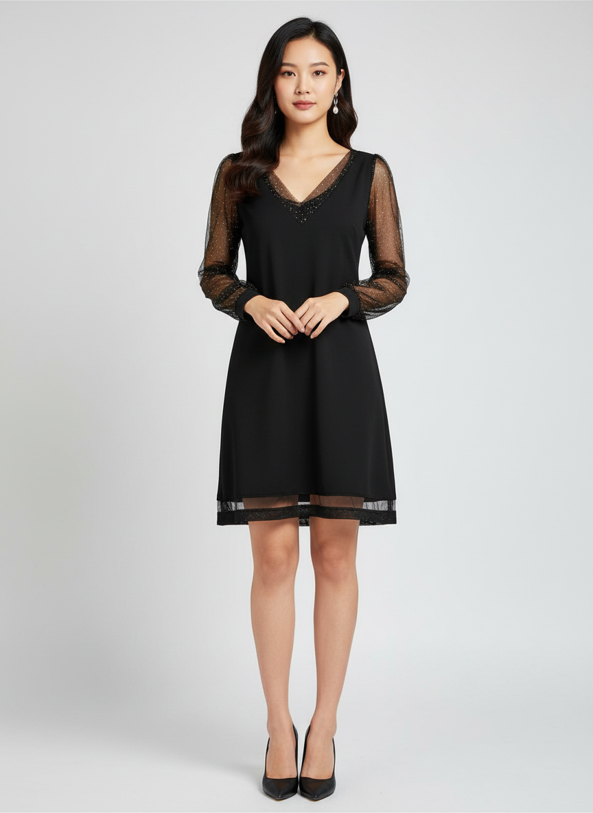 Laat uzelf stralen in deze adembenemende zwarte mini-jurk, ontworpen voor de moderne vrouw die elegantie en allure zoekt. De jurk combineert een verleidelijke diepe V-hals met lange, doorschijnende mouwen die subtiel versierd zijn met schitterende goudflinters. Deze details vangen het licht bij elke beweging en voegen een vleugje glamour toe aan uw outfit.