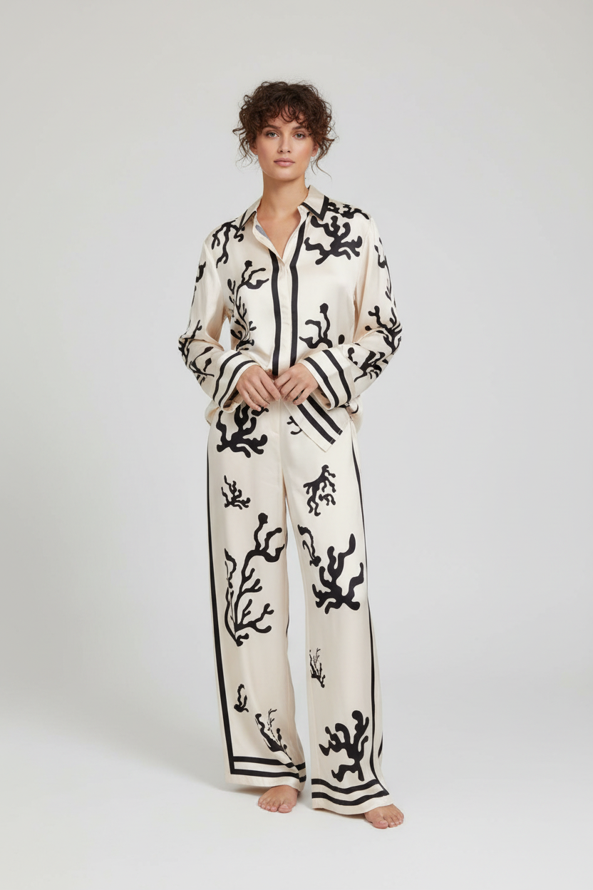 Ervaar ultieme elegantie met deze satijnen set (blouse + broek) van Dea Studios. De luxe zijde-achtige stof voelt zacht en soepel aan, terwijl de relaxte, oversized pasvorm zorgt voor maximaal comfort. De unieke, artistieke print geeft de set een moderne en stijlvolle uitstraling, ideaal voor zowel casual chic momenten als avondgelegenheden.