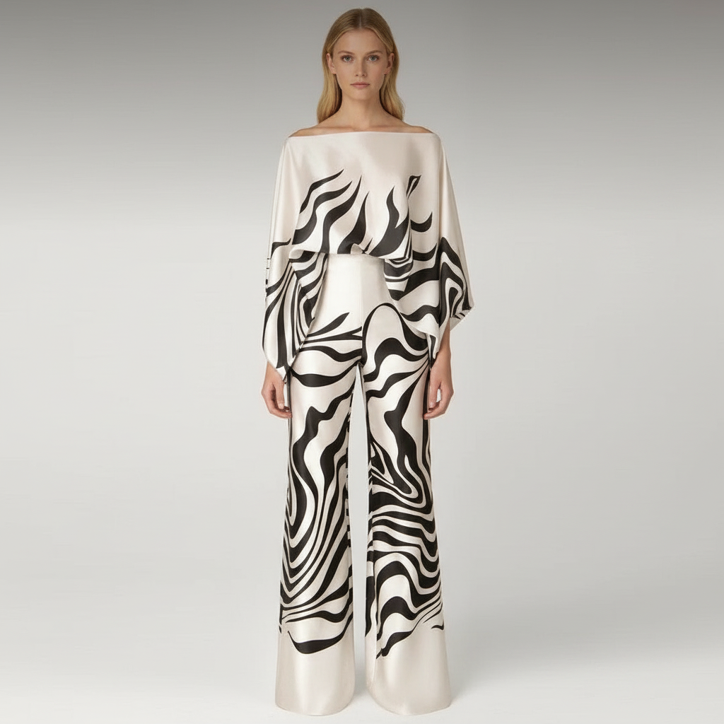 Laat een onuitwisbare indruk achter met deze adembenemende two-piece set van Dea Studios. Het gedurfde zwart-wit golfpatroon op glanzende, satijnachtige stof creëert een elegant en avant-gardistisch silhouet. De combinatie van een wijde pantalon en een zwierige off-shoulder top zorgt voor een moeiteloze, luxueuze uitstraling — ideaal voor avondkleding en formele evenementen. Verkrijgbaar in meerdere kleuren en maten.