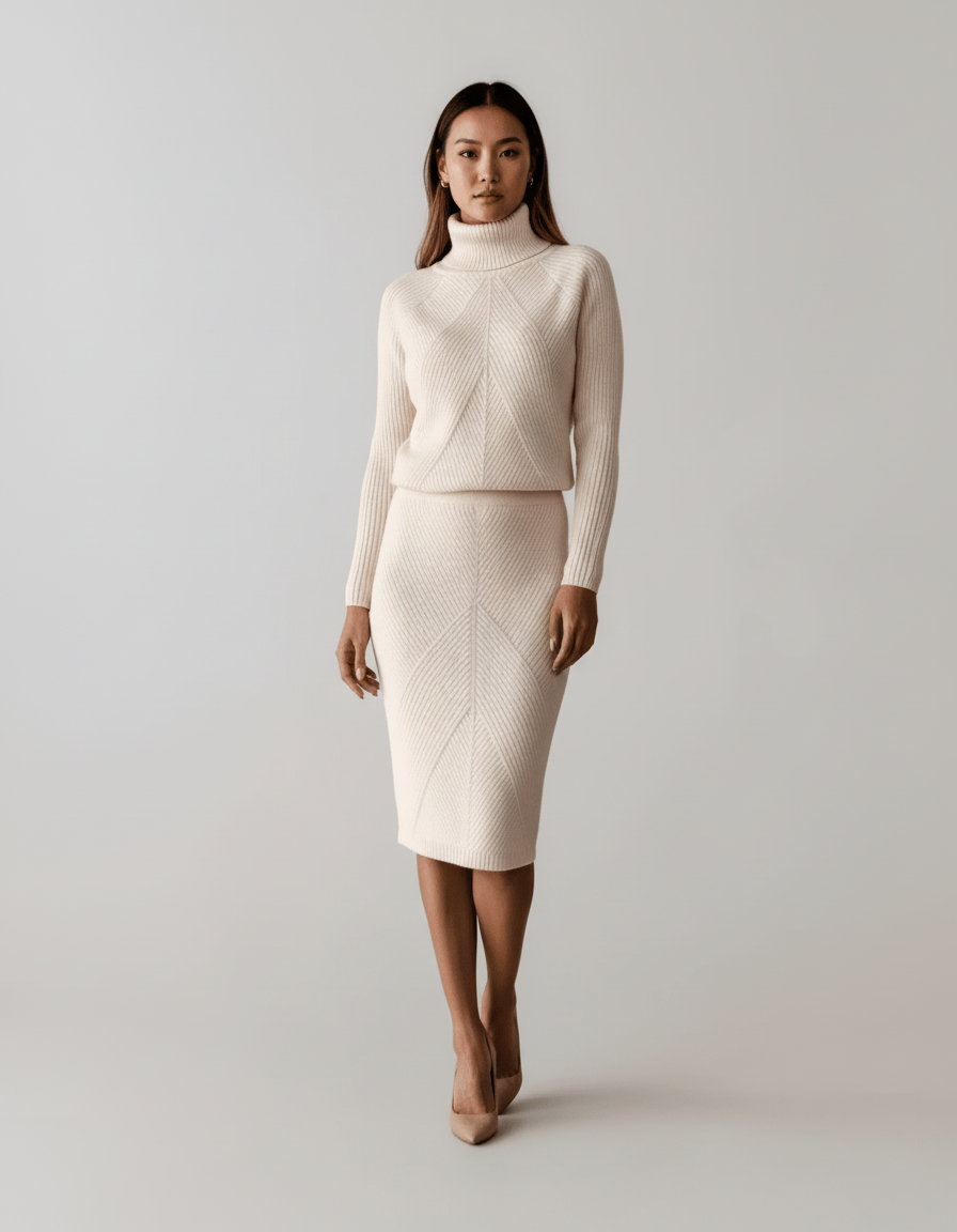 Deze stijlvolle gebreide set combineert comfort en mode in één moeiteloze look. De relaxte coltrui biedt warmte en draaggemak, terwijl de bijpassende aansluitende rok zorgt voor een flatterend en elegant silhouet. Het unieke chevronpatroon geeft de set een trendy, moderne uitstraling. Perfect voor zowel casual momenten als chique gelegenheden. Verkrijgbaar in meerdere kleuren en maten.