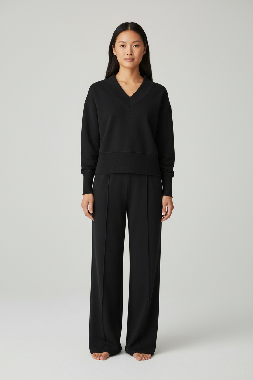 - Zachte V-hals sweater en wijde broek