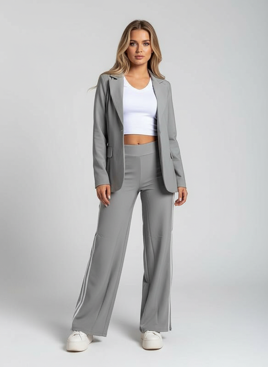 Ervaar de perfecte combinatie van comfort en hedendaagse mode met onze exclusieve Polyester Blend Set. Deze set, bestaande uit een relaxte blazer en een wijde broek, is ontworpen voor de moderne vrouw die waarde hecht aan zowel stijl als gemak. De opvallende contrasterende zwarte strepen langs de mouwen en zijkanten van de broek voegen een sportieve, chique touch toe aan het geheel.