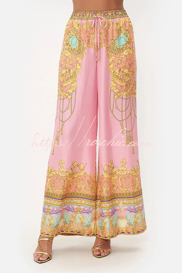 Ervaar ongeëvenaard comfort en stijl met deze luxe zijden loungewear set van Dea Studios. Gemaakt van hoogwaardige zijde voelt de set uitzonderlijk zacht en koel aan op de huid. Het opvallende barokprintdesign met goud- en turkooisaccenten geeft de look een elegante, koninklijke uitstraling. De relaxte pasvorm, het lange shirt met kraag en de wijde palazzo broek maken deze set tot een verfijnde aanvulling op elke loungewear collectie.