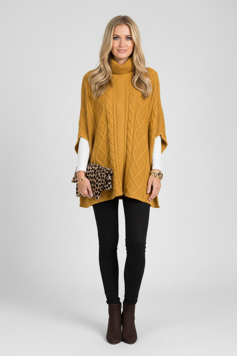 Gebreide Poncho voor Dames – Hoge Kraag & Klassiek Kabelpatroon