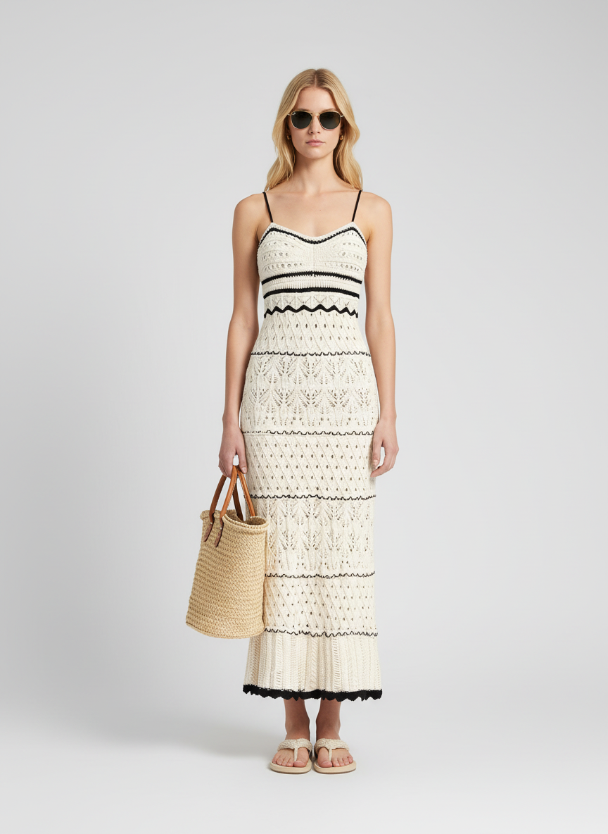Laat je betoveren door de 'Paros' jurk, een meesterwerk van Dea Studios dat de essentie van zomerse elegantie vangt. Deze gebroken witte midi jurk is vervaardigd uit een verfijnd haakwerk, perfect voor de zonnige dagen en zorgeloze vakanties. Het fitted silhouet flatteert elk figuur, terwijl de subtiele horizontale zwarte strepen, inclusief speelse golvende patronen en open gebreide secties, een uniek visueel accent toevoegen. De zwarte gehaakte rand aan de zoom rondt het design af met een stijlvol contrast.
