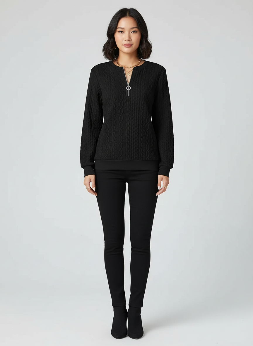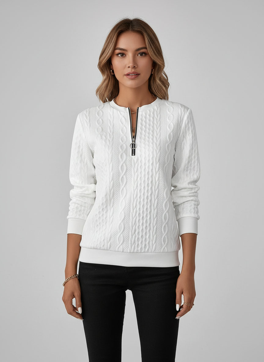 Verrijk je garderobe met deze dames trui, een meesterwerk van comfort en stijl. Dit casual chique kledingstuk is ontworpen om je moeiteloos elegant te laten voelen, waar je ook gaat. De unieke textuur, geïnspireerd op klassieke kabelbreisels, geeft deze moderne half-rits trui een luxueuze uitstraling. De zilverkleurige ring van de ritssluiting voegt een vleugje verfijning toe, waardoor het een perfecte keuze is voor zowel ontspannen weekenden als stijlvolle dagelijkse outfits.