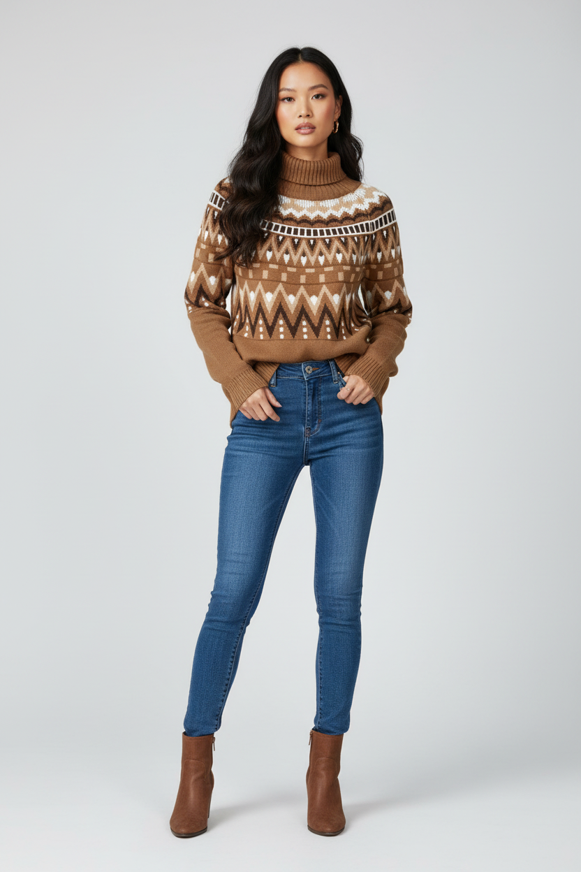 Laat je omhullen door de warme elegantie van onze unieke gebreide pullover. Ontworpen met een oog voor detail en een liefde voor comfort, is dit kledingstuk een ware aanwinst voor je herfstgarderobe. Het gedurfde, geometrische patroon in rijke aardetinten, zoals Abrikoos, Roest, Khaki en Zwart, spreekt tot de verbeelding en voegt een artistieke flair toe aan elke outfit.