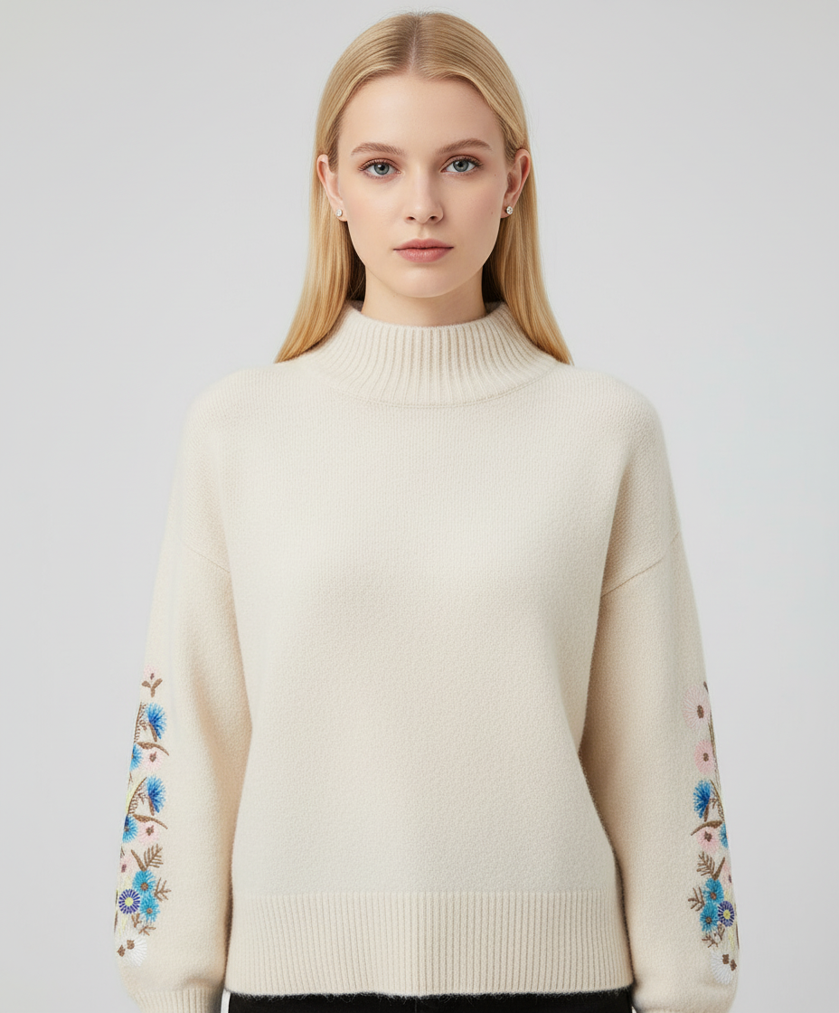 Deze dames cardigan is vervaardigd uit een zachte, hoogwaardige breimix die direct luxe en comfort biedt. De kleurrijke bloemenborduursels op de elegante trompetmouwen geven het vest een verfijnde, artistieke uitstraling die elke outfit bijzonder maakt. De relaxte pasvorm met lage schouders en een subtiel geribbelde hals zorgt voor een moeiteloze, vrouwelijke look.