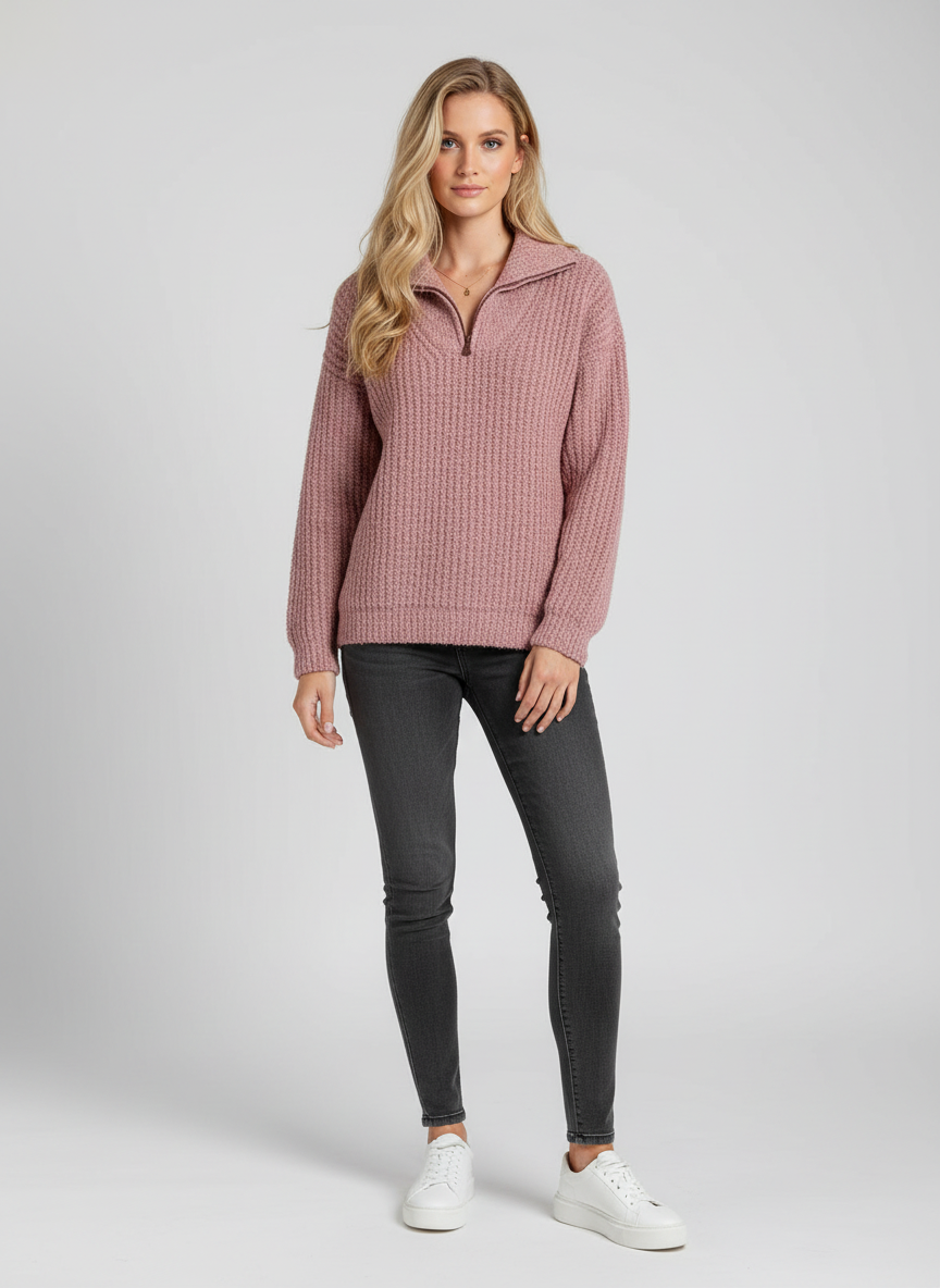 Ervaar het ultieme comfort met onze exclusieve dames trui, ontworpen voor de moderne vrouw die waarde hecht aan zowel stijl als gemak. Deze trui is vervaardigd uit een luxueuze breimix die zacht aanvoelt op de huid en een subtiel, gemêleerd effect heeft dat elke outfit naar een hoger niveau tilt. De relaxte pasvorm garandeert een comfortabele draagervaring, perfect voor zowel ontspannen weekenden als drukke weekdagen.