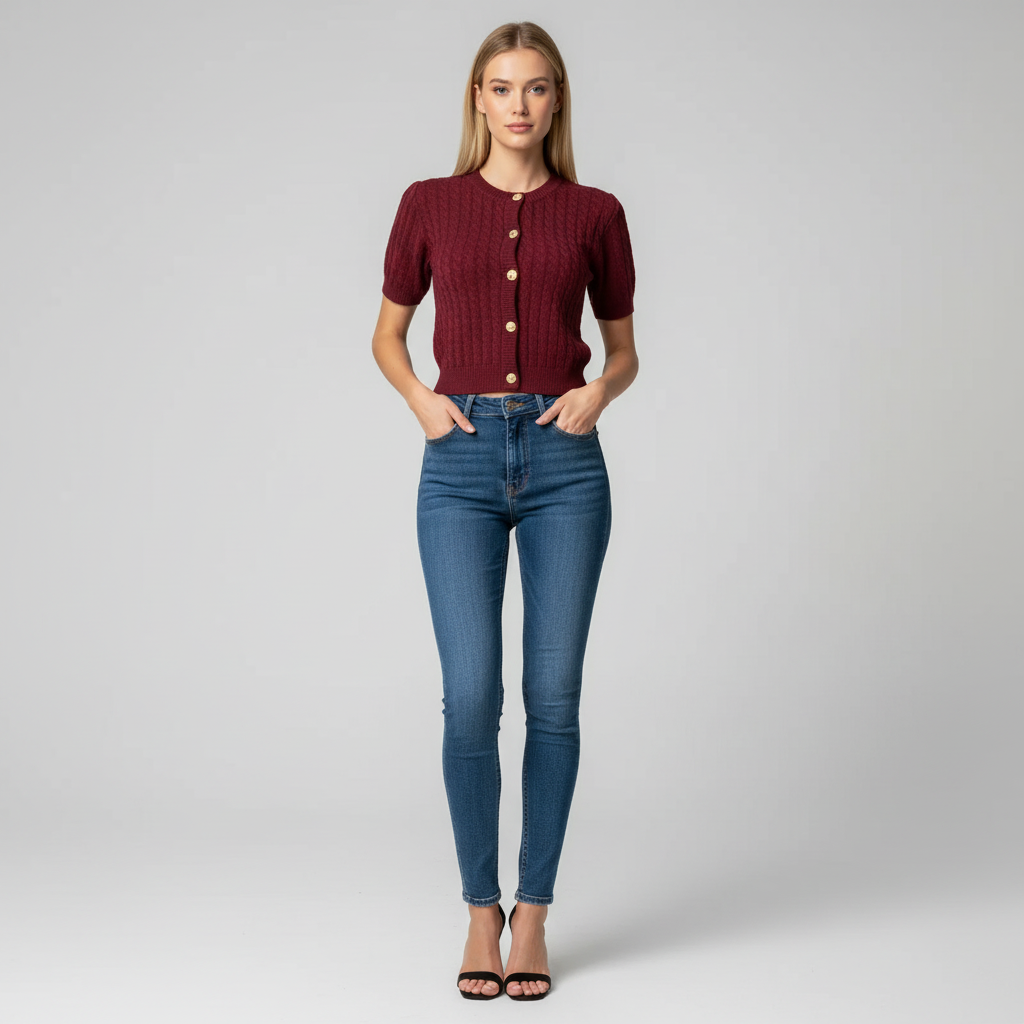 Deze cropped dames cardigan is vervaardigd uit zacht, duurzaam breiwerk met een rijke kabelstructuur die direct een luxe, warme uitstraling geeft. De elegante cropped pasvorm accentueert subtiel de taille en zorgt voor een modern, vrouwelijk silhouet.