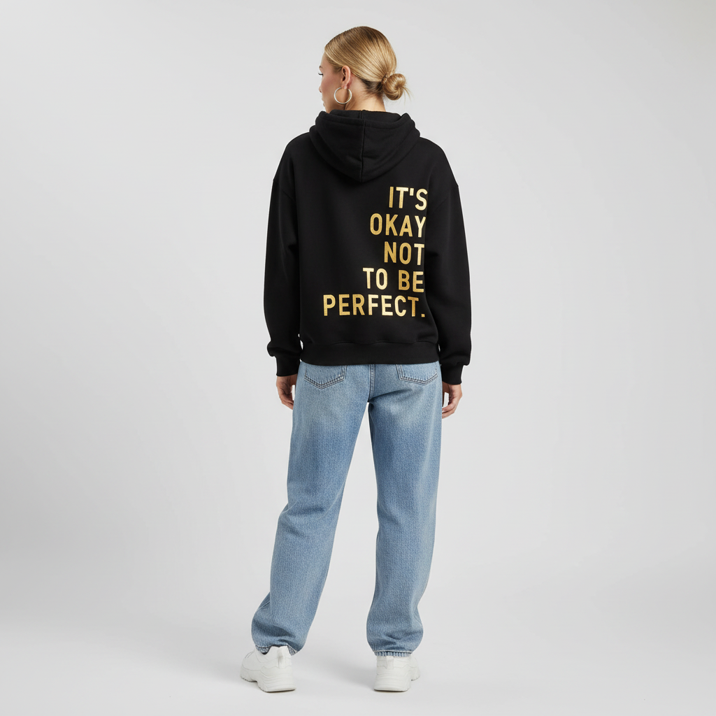 De Noelle oversized hoodie is dé must-have voor wie comfort en stijl wil combineren. Met zijn losse, relaxte pasvorm en zachte stof voelt deze hoodie heerlijk cozy aan, terwijl de klassieke capuchon en kangoeroezak zorgen voor extra functionaliteit. Op de achterkant staat de opvallende tekst “It’s okay not to be perfect”, wat dit item een speelse en unieke streetwear-touch geeft.