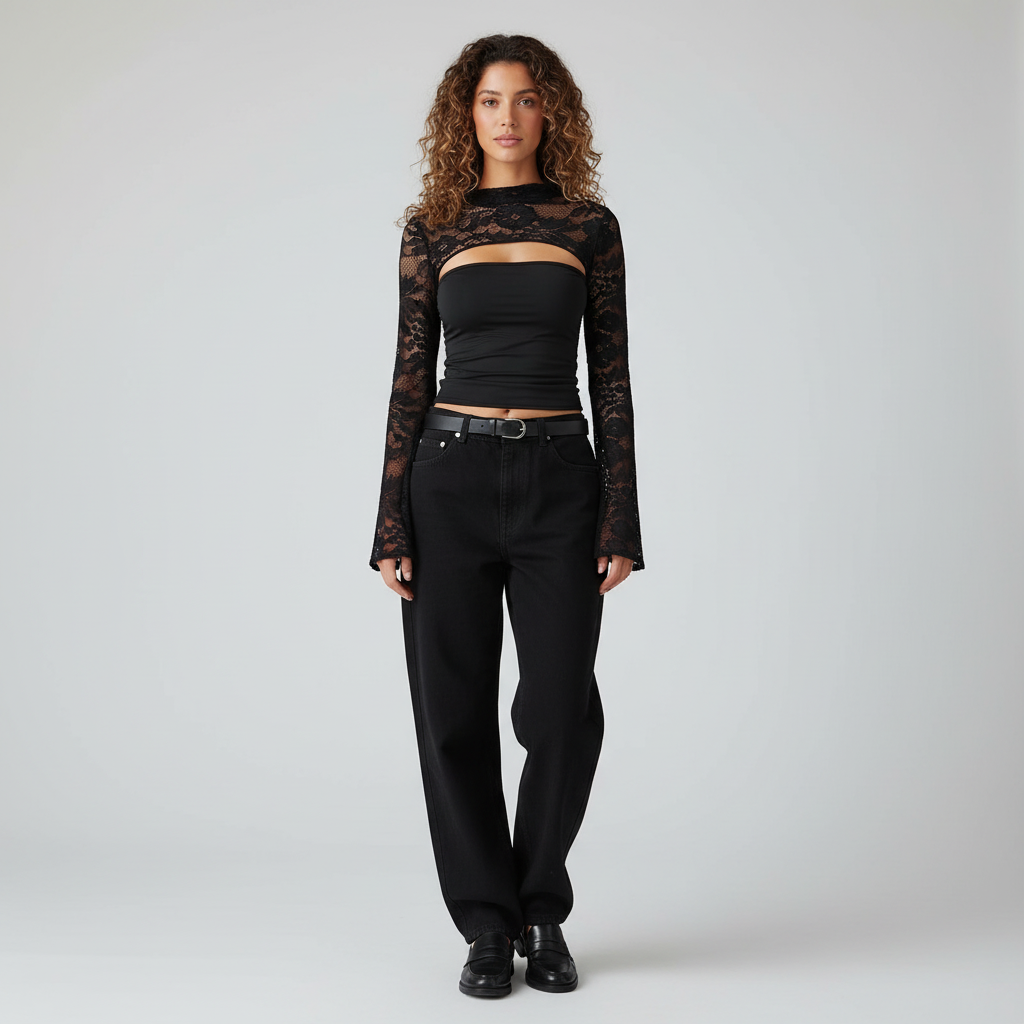 Dames Kanten Top – Zwarte Chique Kanten Top Met Wijde Kantmouwen