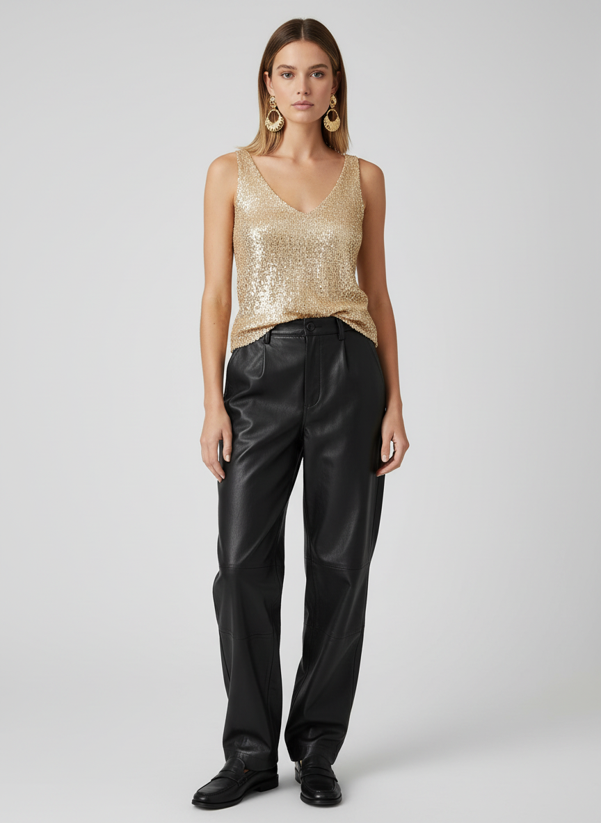 Schitter als nooit tevoren met onze adembenemende mouwloze V-hals top, volledig versierd met glanzende gouden pailletten. Deze top is ontworpen om u in het middelpunt van de belangstelling te plaatsen, waar u ook gaat. De lichtgewicht constructie en flatterende V-hals creëren een elegant silhouet, perfect voor elke speciale gelegenheid.