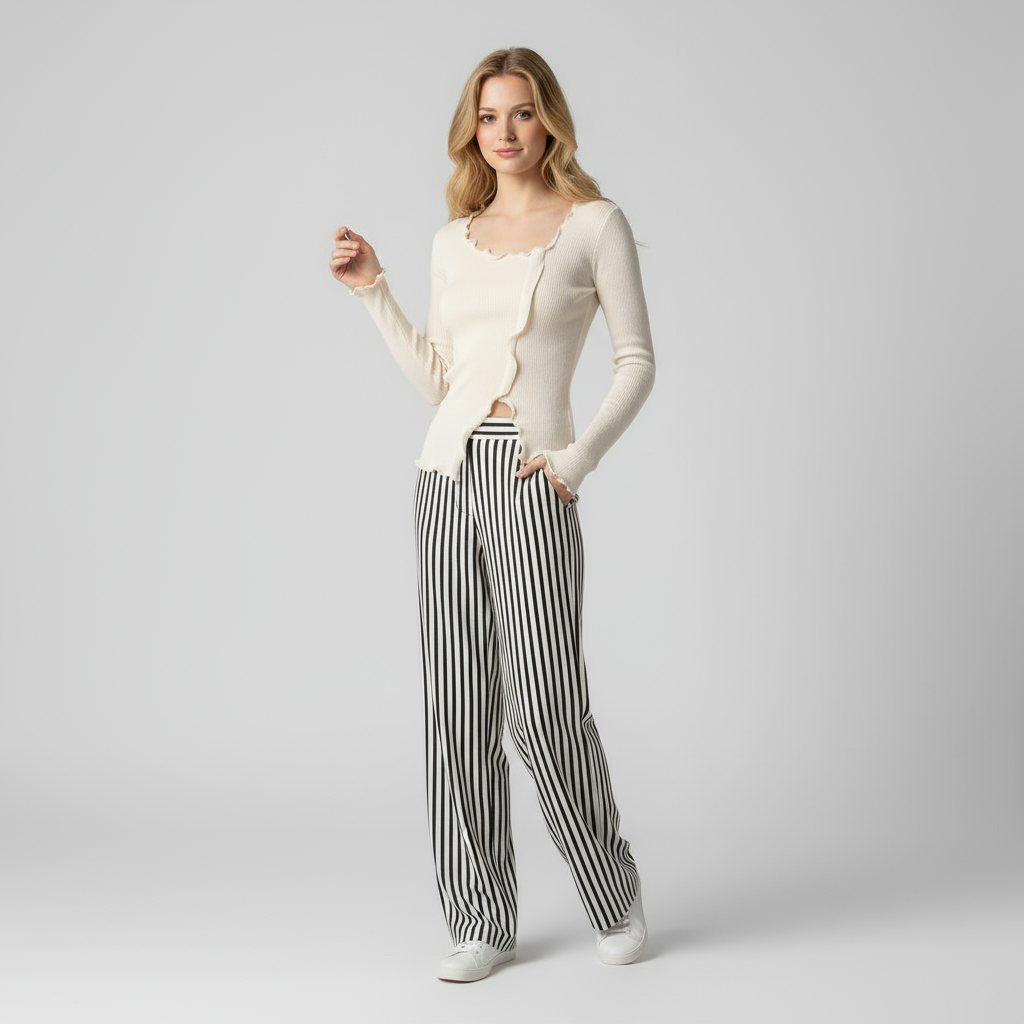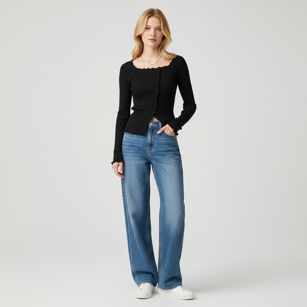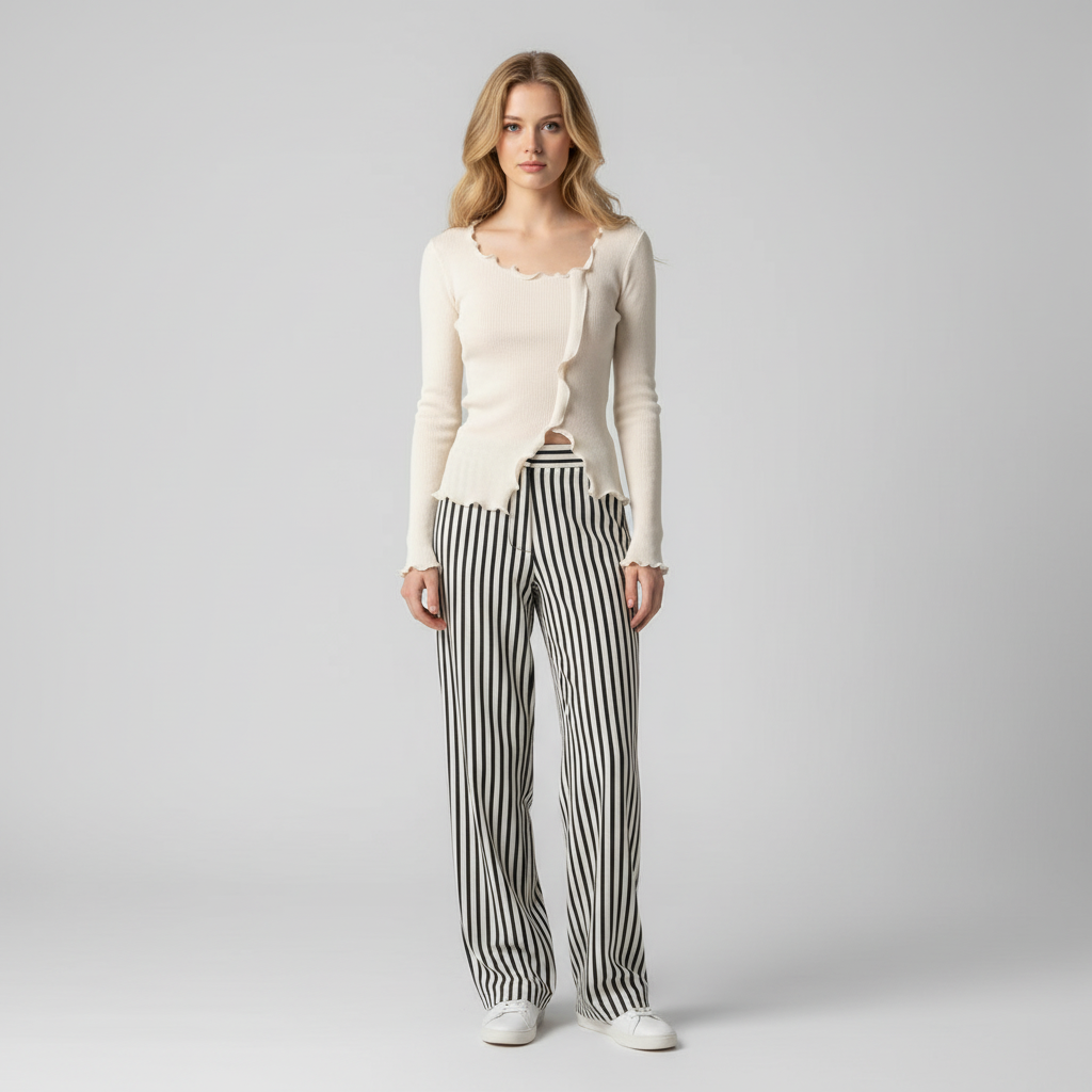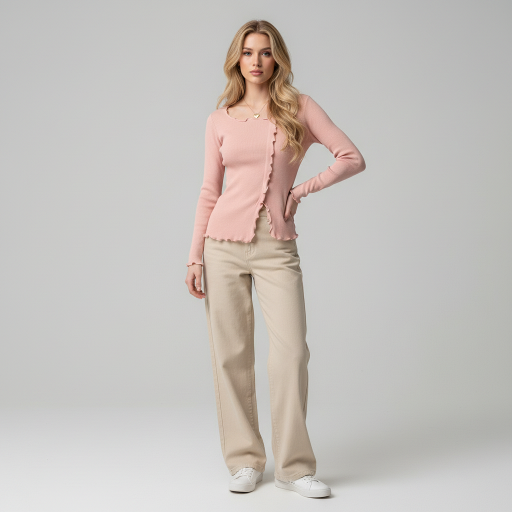 - Subtiele V-hals en fijne ribdetails voor moeiteloze chic