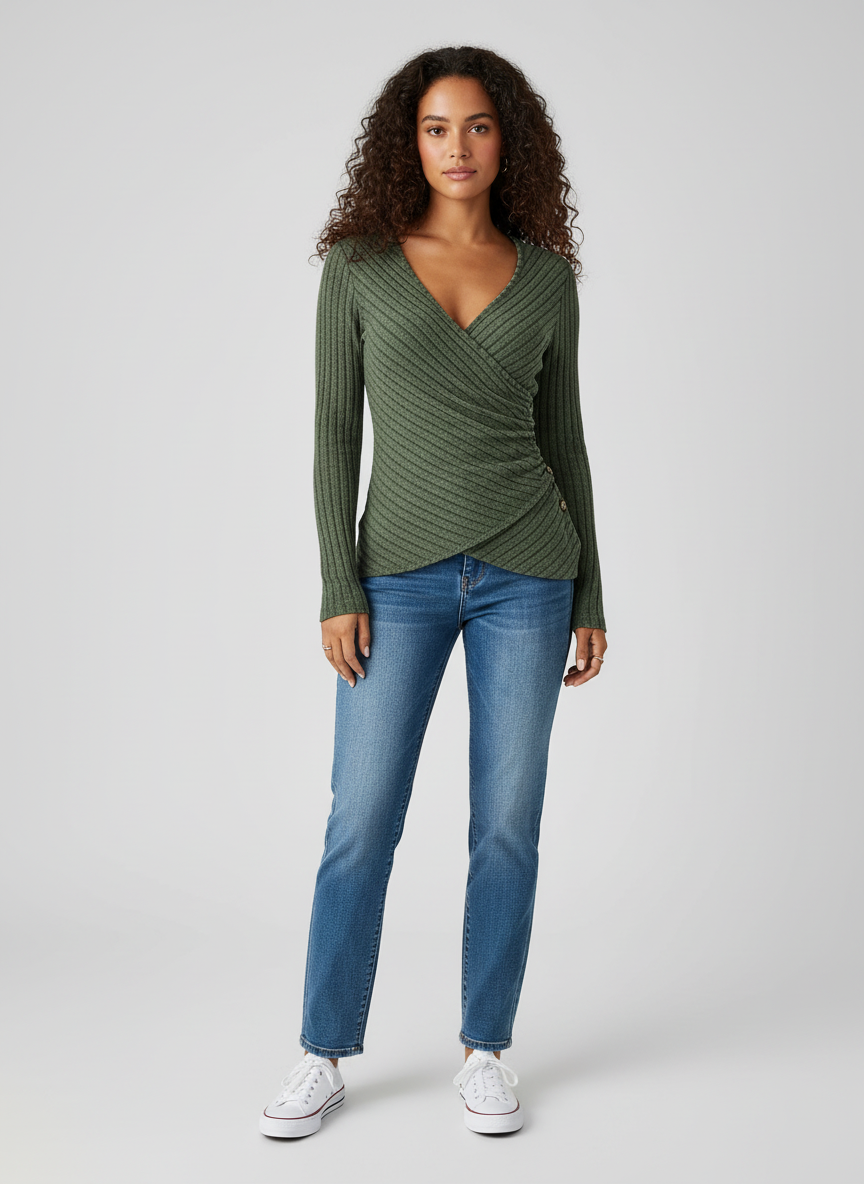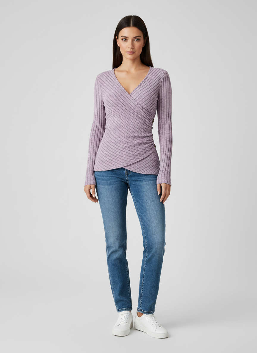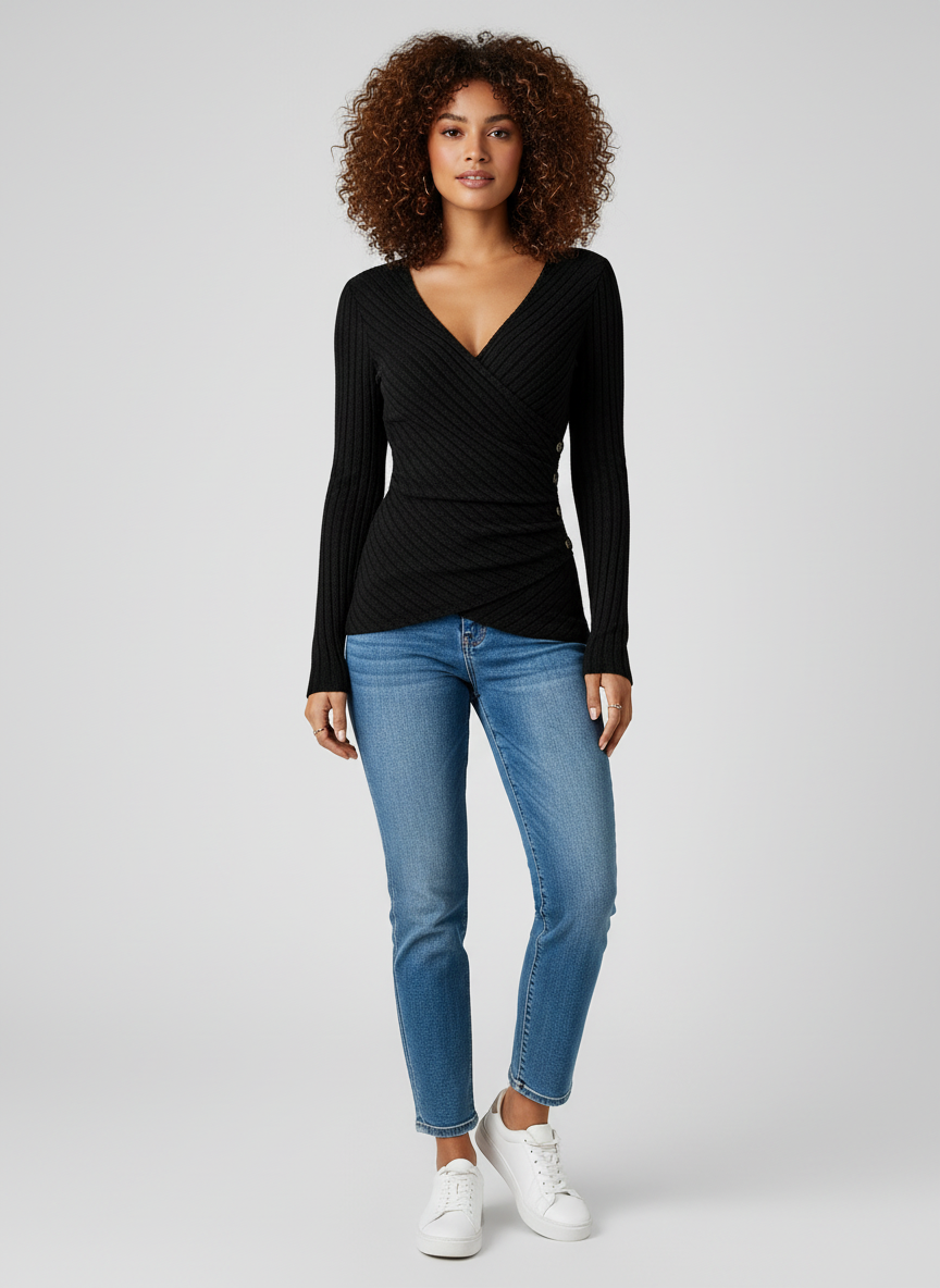 Ribgebreide Dames Top met Lange Mouwen en V-hals