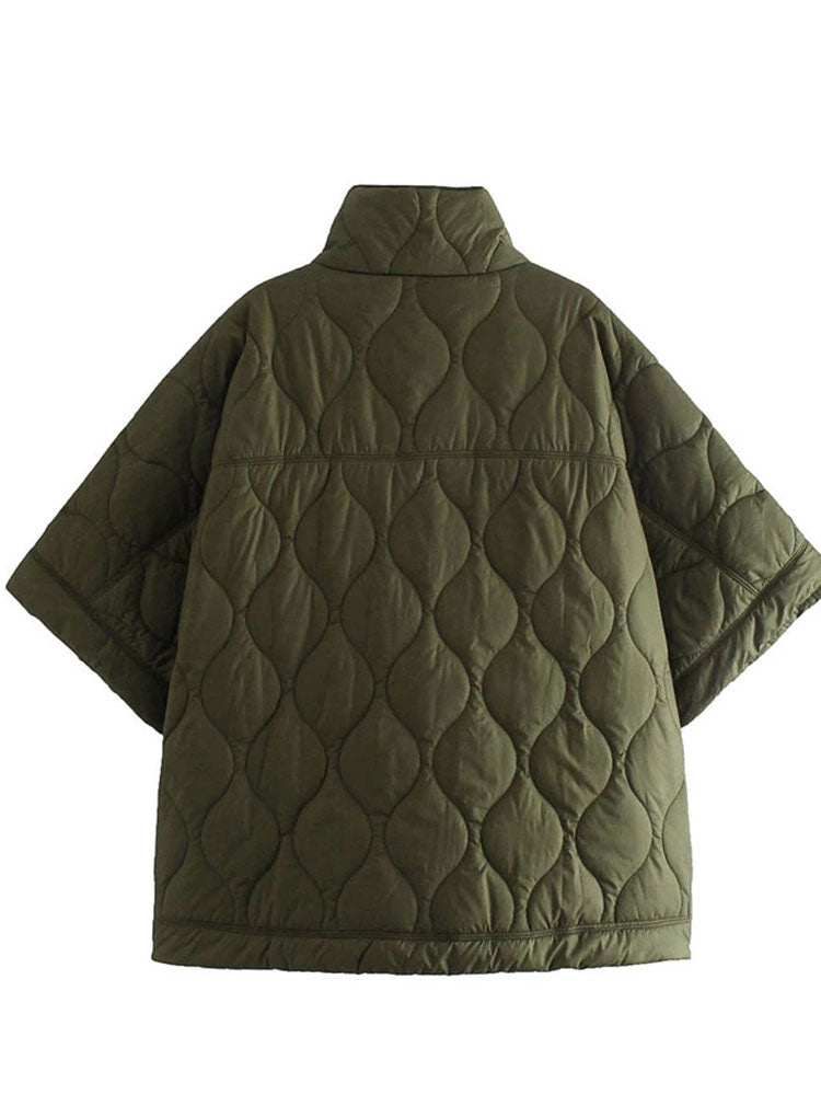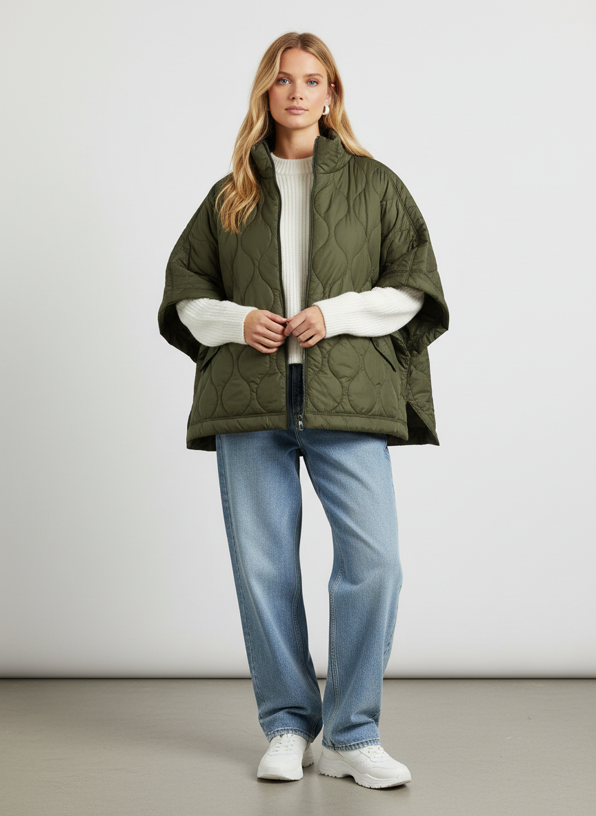 Ervaar de perfecte combinatie van moderne stijl en comfort met onze exclusieve gewatteerde jas. Ontworpen met een uniek, cape-achtig silhouet en voorzien van korte, wijde mouwen, biedt deze jas een eigentijdse benadering van winterse bovenkleding. De hoge kraag voegt een vleugje verfijning toe, terwijl het subtiele ruitvormige stikselpatroon de rijke olijfgroene kleur accentueert.