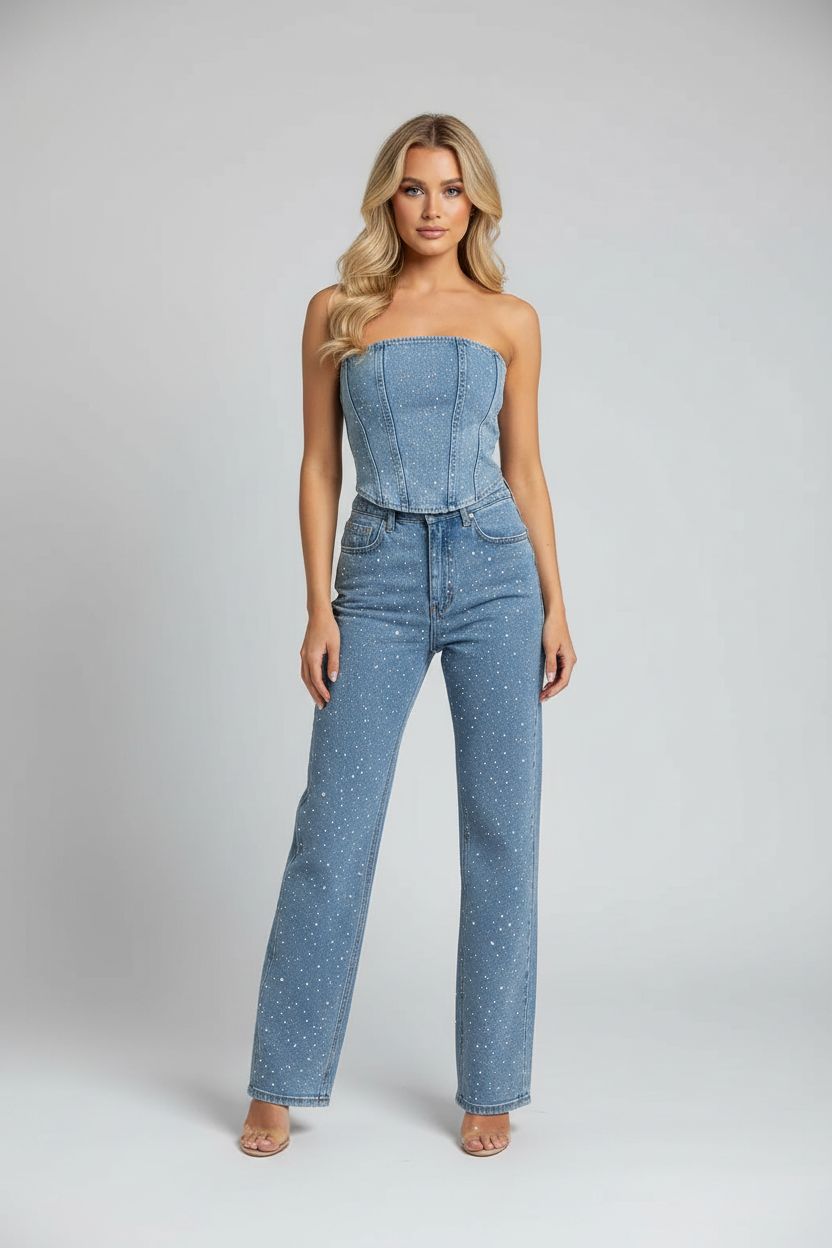 Stap in de schijnwerpers met deze spectaculaire jumpsuit, ontworpen voor de vrouw die geen genoegen neemt met minder dan perfectie. Voel de luxe van de stof terwijl de duizenden pailletten elke beweging vangen, waardoor u een onvergetelijke indruk achterlaat. Dit is niet zomaar kleding; het is een statement van zelfvertrouwen en pure glamour, perfect voor die momenten waarop u wilt stralen als nooit tevoren. De combinatie van een gedurfde, strapless halslijn en de vloeiende, wijde pijpen zorgt voor een silhouet dat zowel modern als tijdloos is. Laat de avond van u zijn.