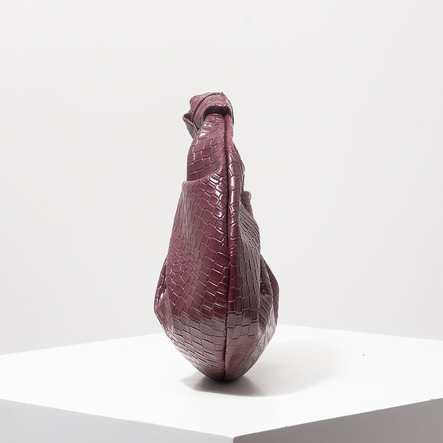 Voeg dit sculpturale bordeaux tasje toe aan je collectie en geniet van pure luxe, tijdloze allure en unieke vormgeving—een accessoire dat elk speciaal moment extra bijzonder maakt.