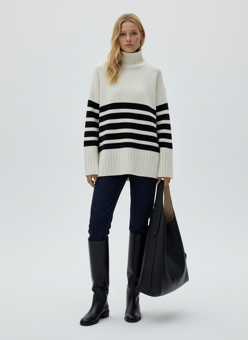 Deze luxe gebreide damestrui ademt pure Parijse elegantie. Het klassieke zwart-wit strepenpatroon geeft de trui een tijdloze, chique uitstraling, terwijl de zachte viscoseblend soepel langs het lichaam valt voor optimaal draagcomfort.