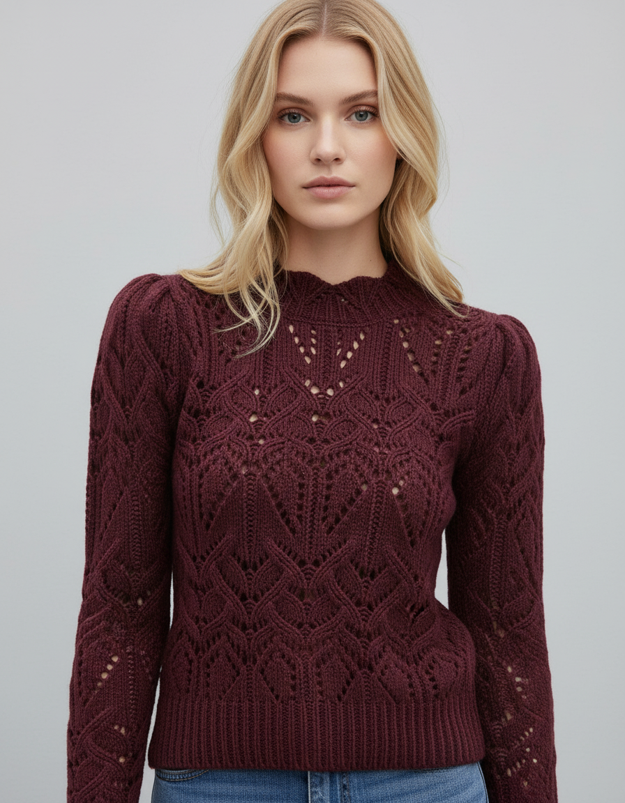 Het complexe opengewerkte patroon, geïnspireerd op delicate kantmotieven, creëert een unieke, ademende textuur die het ontwerp een luxueuze en vrouwelijke uitstraling geeft. Vervaardigd uit een hoogwaardige acrylblend, is deze trui zacht, warm én duurzaam—een ideale keuze voor de koelere maanden.